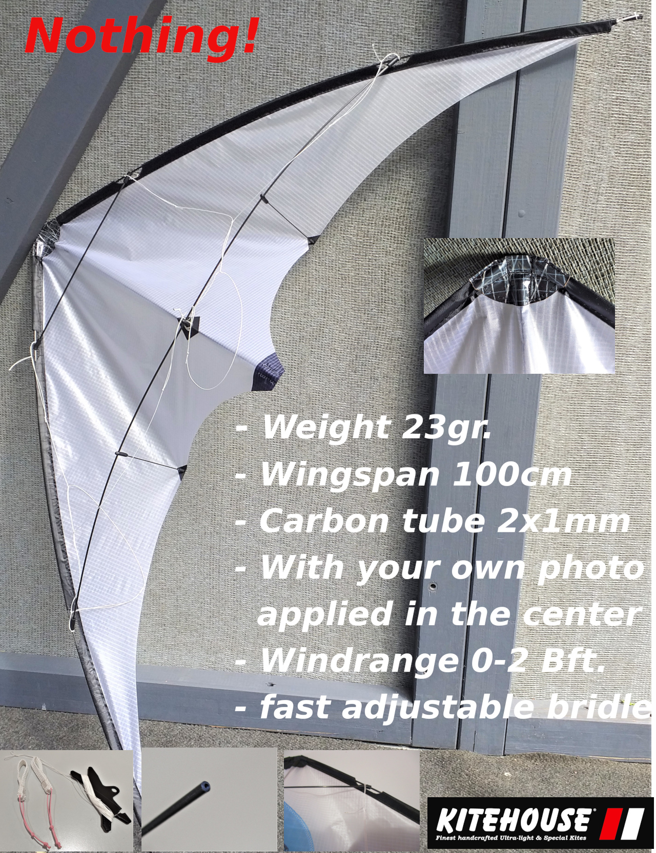 Spannweite 232cm , Segel Ghost, Gerüst Skyshark/CFK 5mm, professionelle Verbindungstechnik, integrierte Gewichtstasche am Kiel, Monofilmverstärkung/Stand-offs. Jojoshields an der oberen Querspreize, Jojostopper.